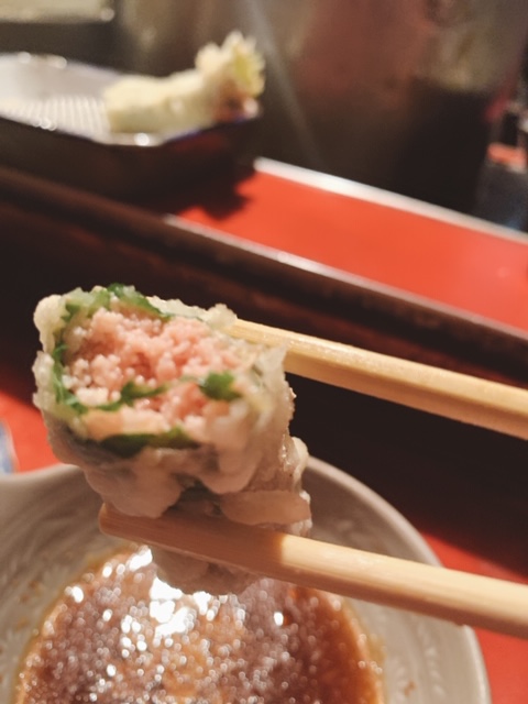 明太子を大葉で巻いた天婦羅です。メニューにはありません。